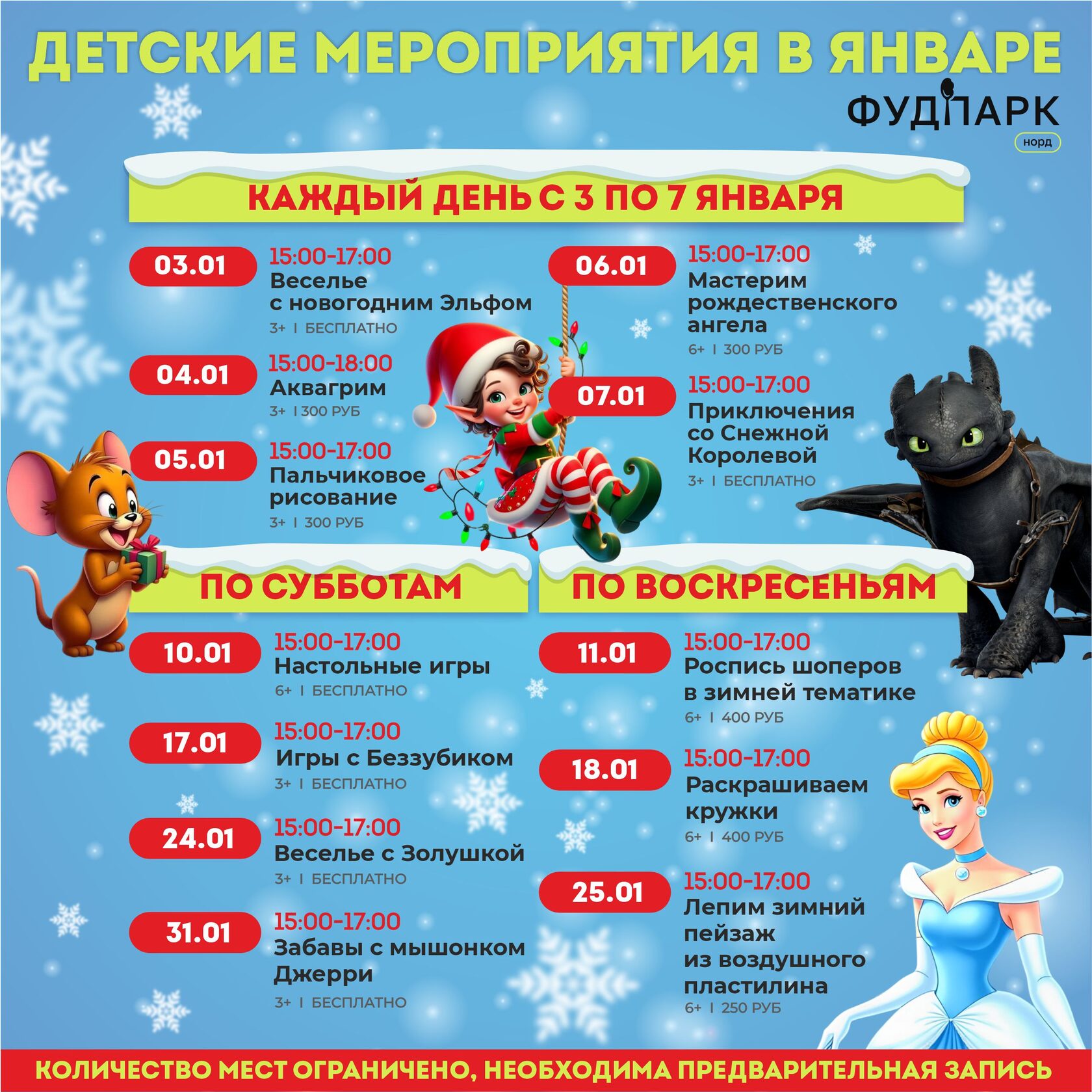 В январе ФудПарк Норд приглашает маленьких гостей на серию увлекательных детских мероприятий. В программе — игровые встречи с любимыми персонажами и творческие мастер-классы, которые подойдут детям разного возраста.